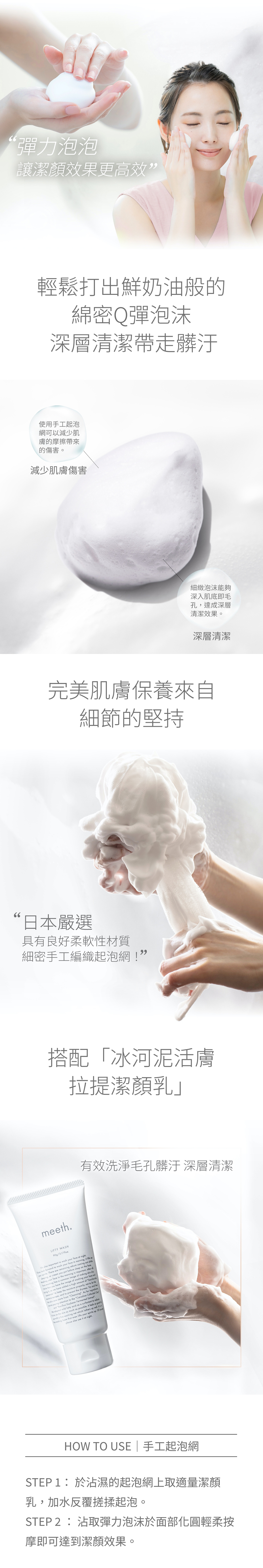 透過細緻富有彈性的泡泡能夠深入肌膚紋理及毛孔,達成深層清潔效果。