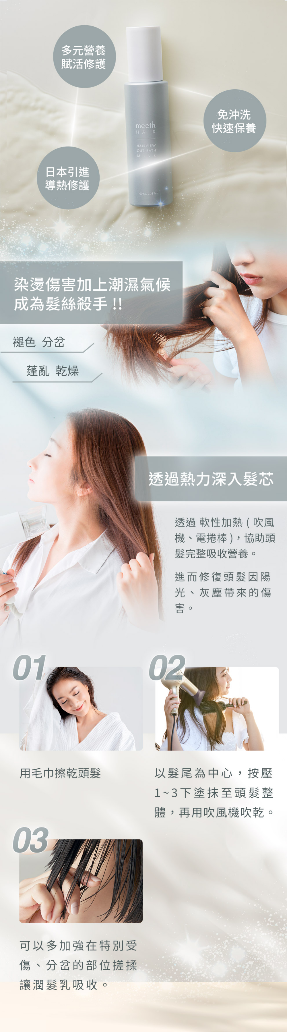 乳液質地不黏膩好吸收,無須沖洗、乾溼髮皆可使用,每天使用一次,快速簡單擁有女神光。