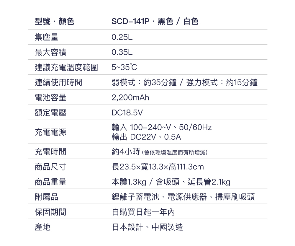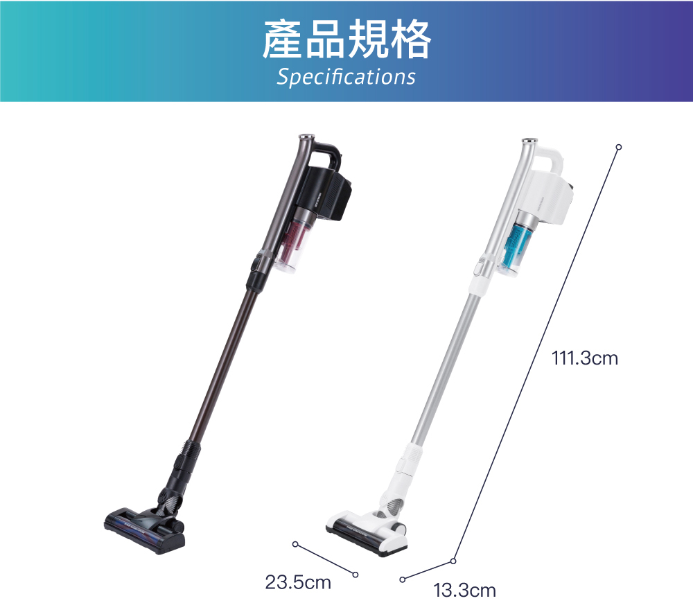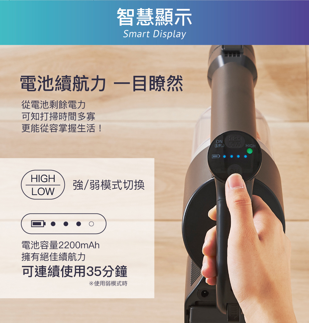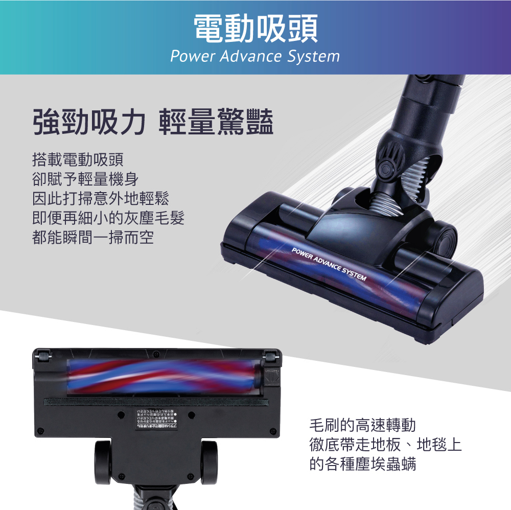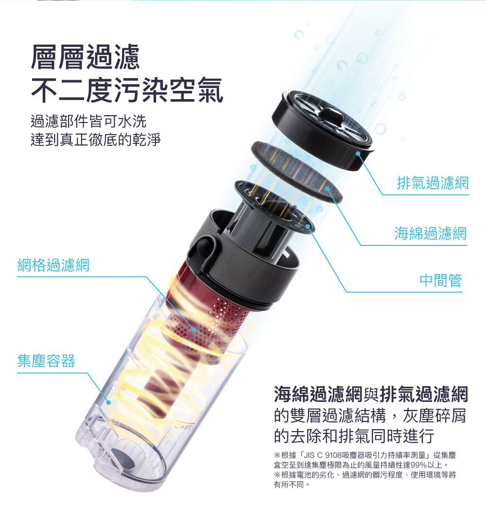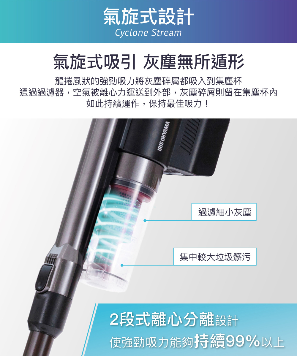 ■ 充電型氣旋式吸塵器,使用2段遠心分離模式維持超強吸力。