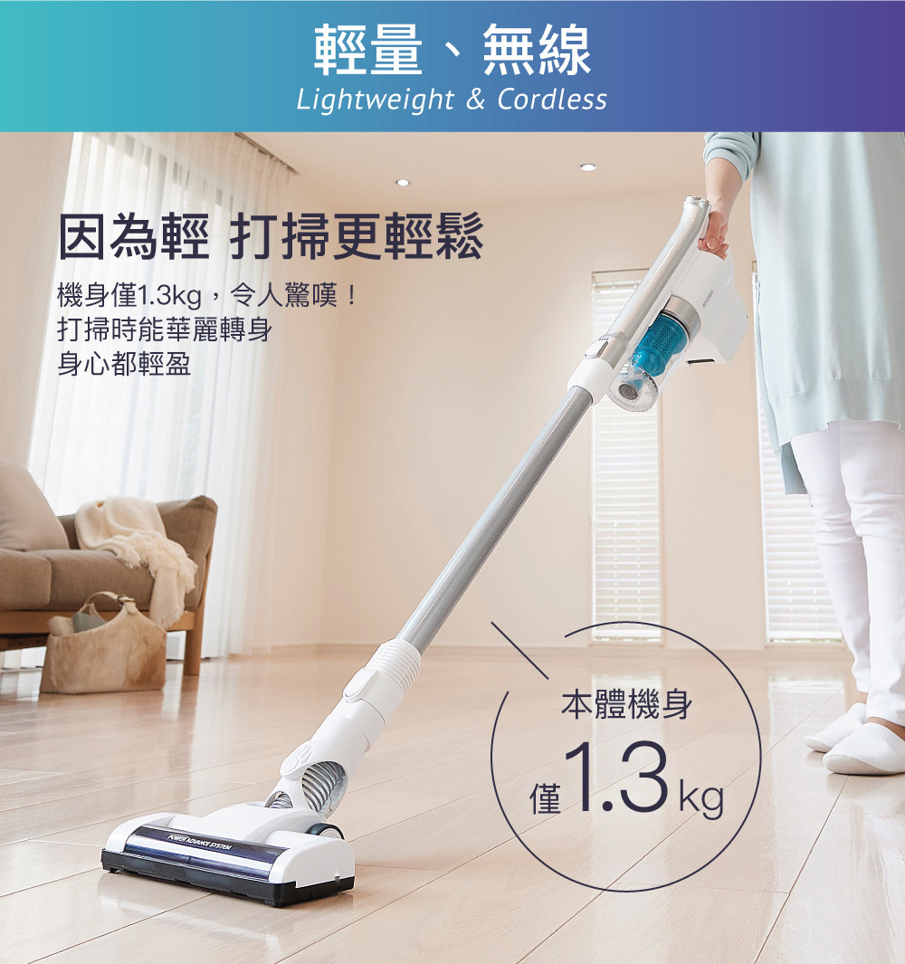 ■ 本體僅1.3kg重,打掃起來不費力。